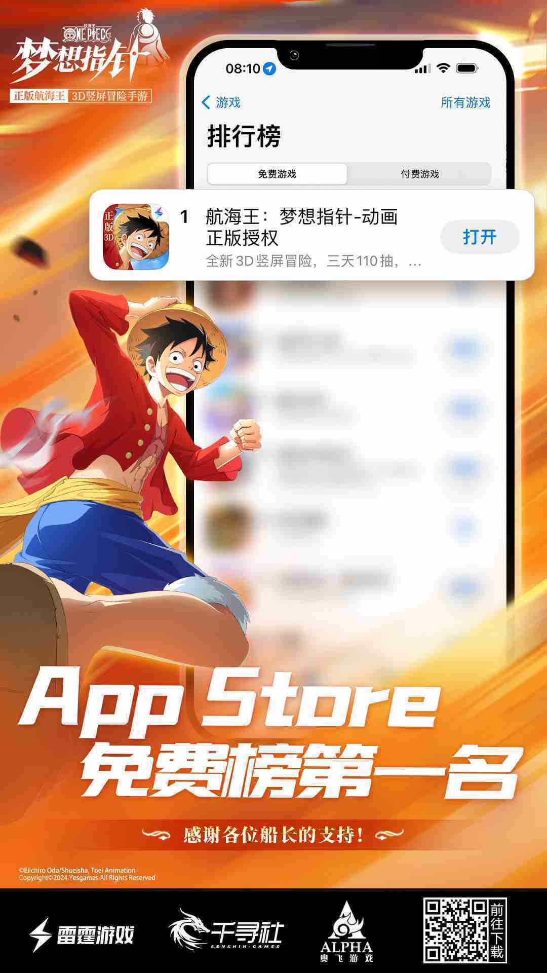《航海王:::梦想指针》登顶App Store免费榜,,,,公测福利汇总!!!!