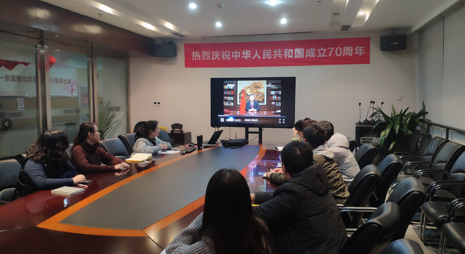 首先,,大家共同观看了国家主席习近平发表的2020年新年贺词视频。。。总书记高瞻远瞩,,回顾了2019年我国所取得的辉煌成就,,,肯定了成绩,,,激励了奋斗精神,,,提升了我们的民族自豪感和生活幸福感。。。展望2020年,,大家要深刻领会讲话精神,,把学习贯彻习近平总书记的新年贺词精神与贯彻党中央决策部署紧密结合,,,,只争朝夕,,不负韶华,,严格要求,,,推动各项工作任务的完成。。
